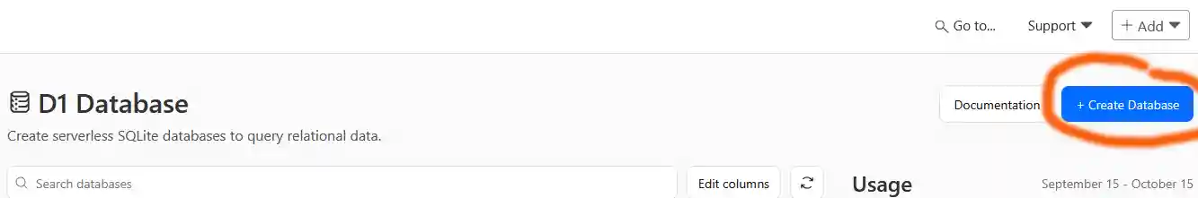In CF sidebar find "Storage & Databases" -> "D1 SQL-database" -> "Create Database"