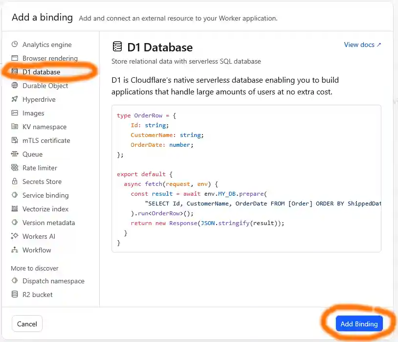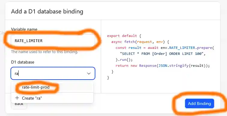 The chose the database this RATE_LIMITER var is to be connected. Just start typing the name of your D1 DB in "D1 database" input field. Then click "Add binding".