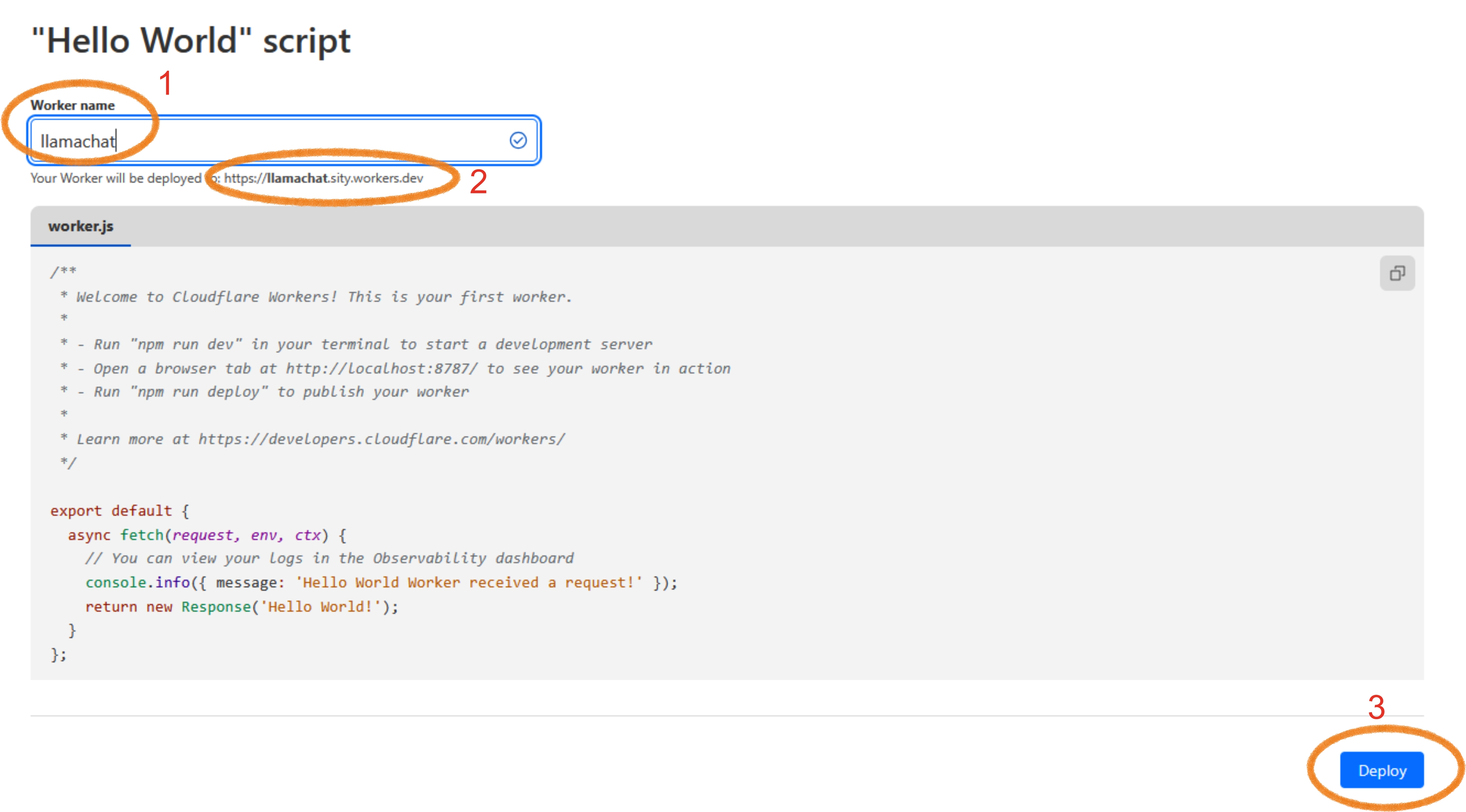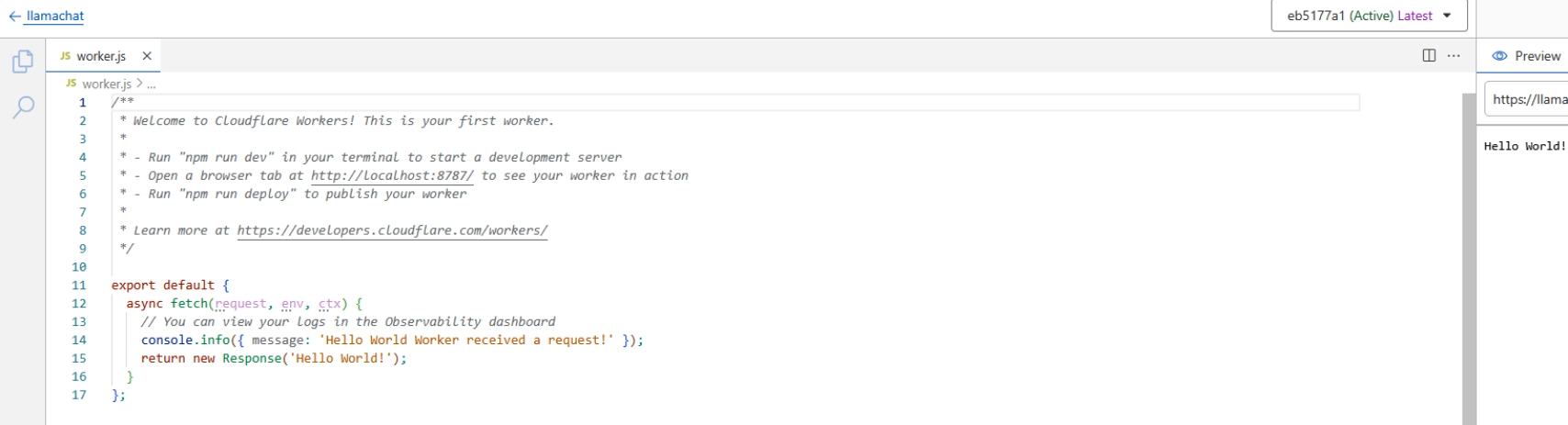 And then continue with "Start with Hello World!". Call your new worker e.g. llamachat: