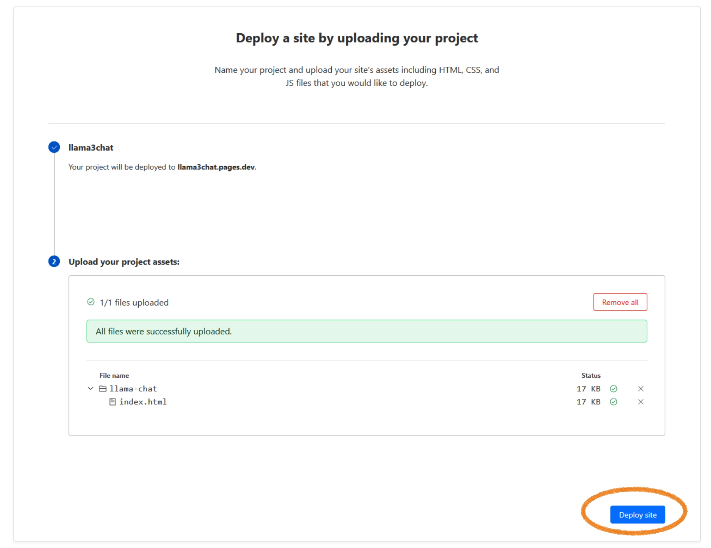 4) Give your project a unique name. I will call mine llama3chat it will be then hosted at https://llama3chat.pages.dev