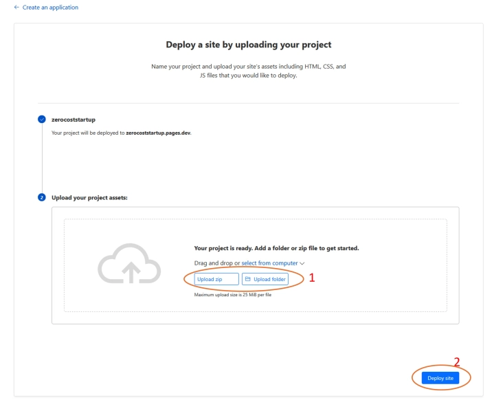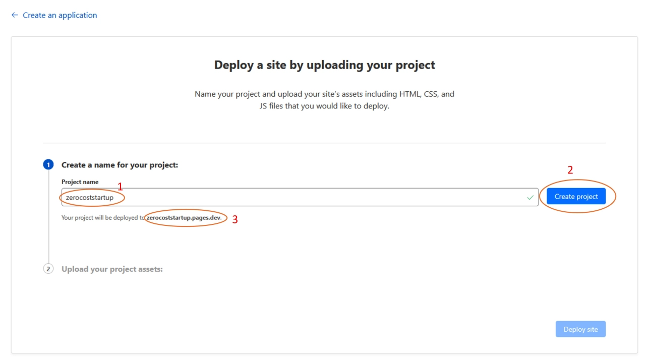 Clicking on "Get started" button would open a dialogue for the project creation. You would need to chose a name for your project. If the name is unique it will become the name of your subdomain, where you web site will be hosted. For example, I chose the name "zerocoststartup" (see screenshot below) and the address of my web site is thus: zerocoststartup.pages.dev.